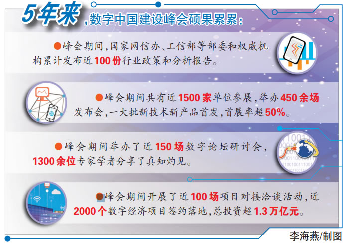 5年来,作为数字中国建设成果展示平台,数字中国建设峰会共有近1500家单位参展,举办450余场发布会,一大批新技术新产品在峰会上首发,首展率超过50%。