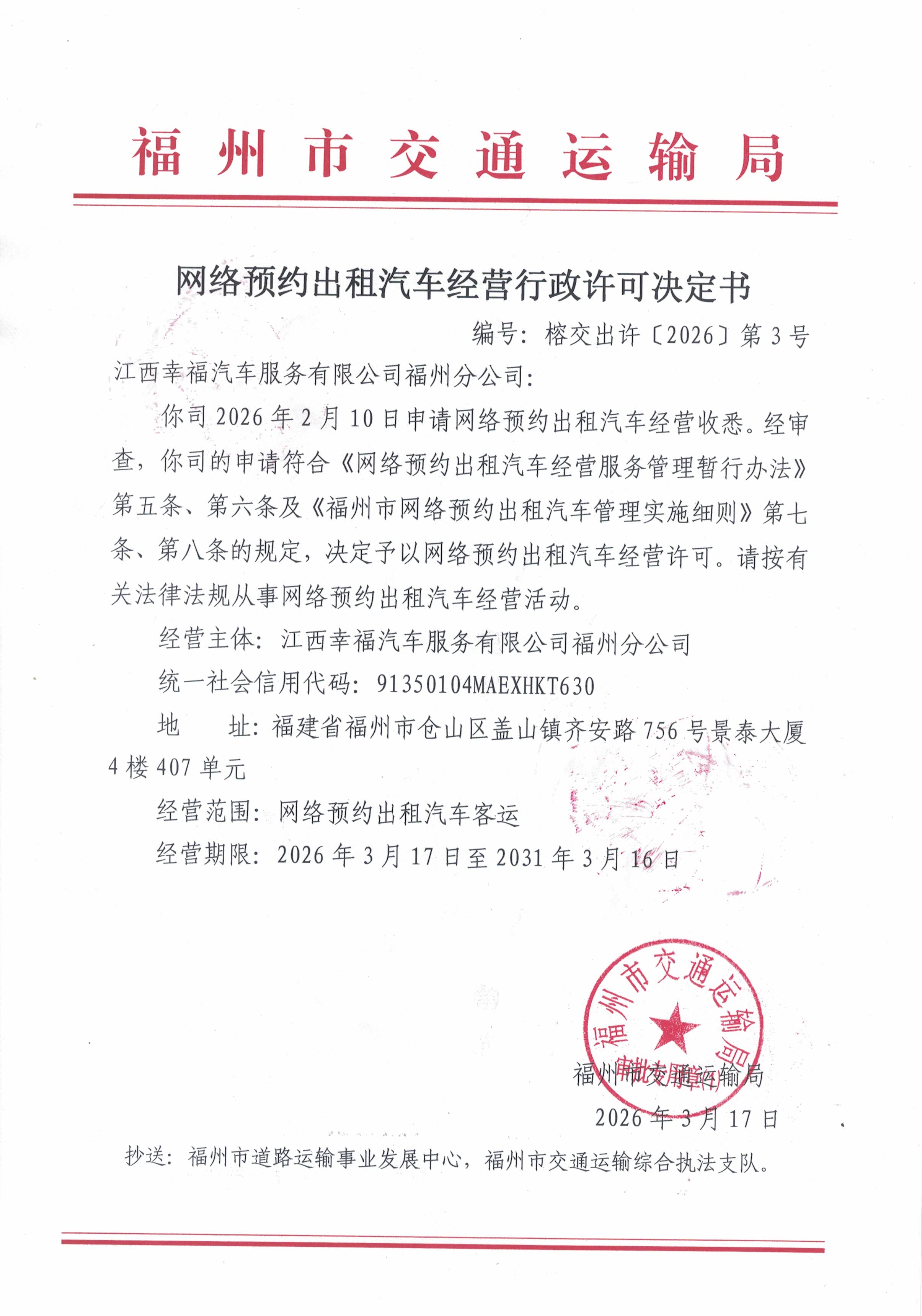 福州市交通运输局关于网络预约出租汽车经营行政许可决定书(榕交出许〔2026〕第3号)