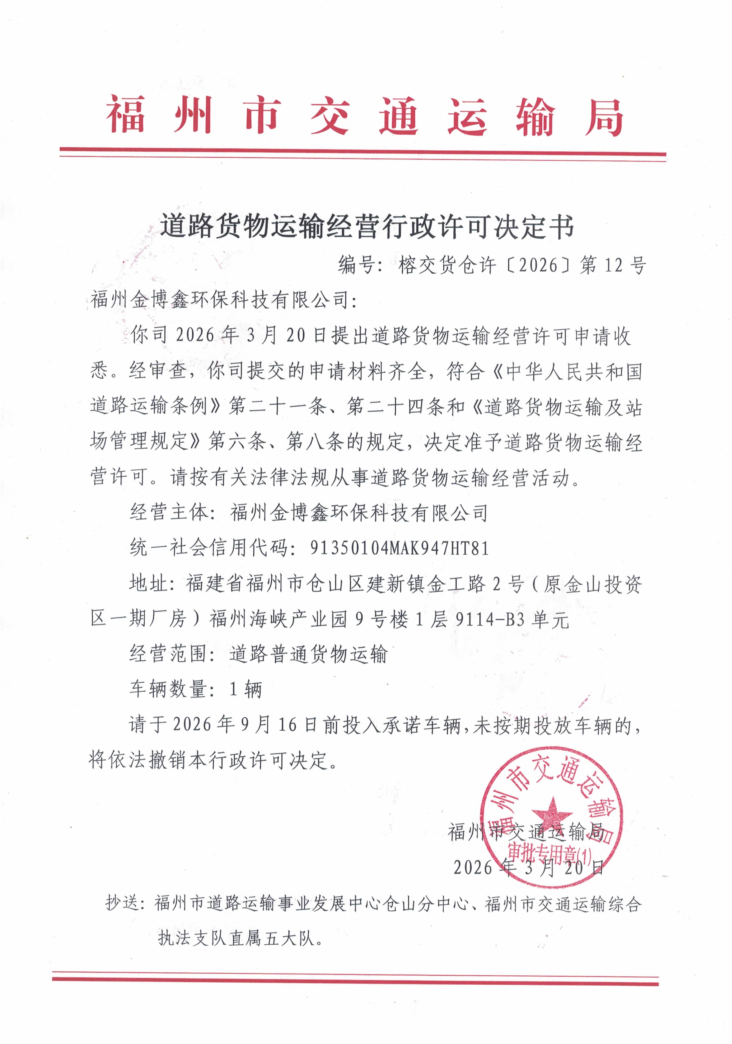 福州市交通运输局关于道路货物运输经营行政许可决定书(榕交货仓许〔2026〕第12号)