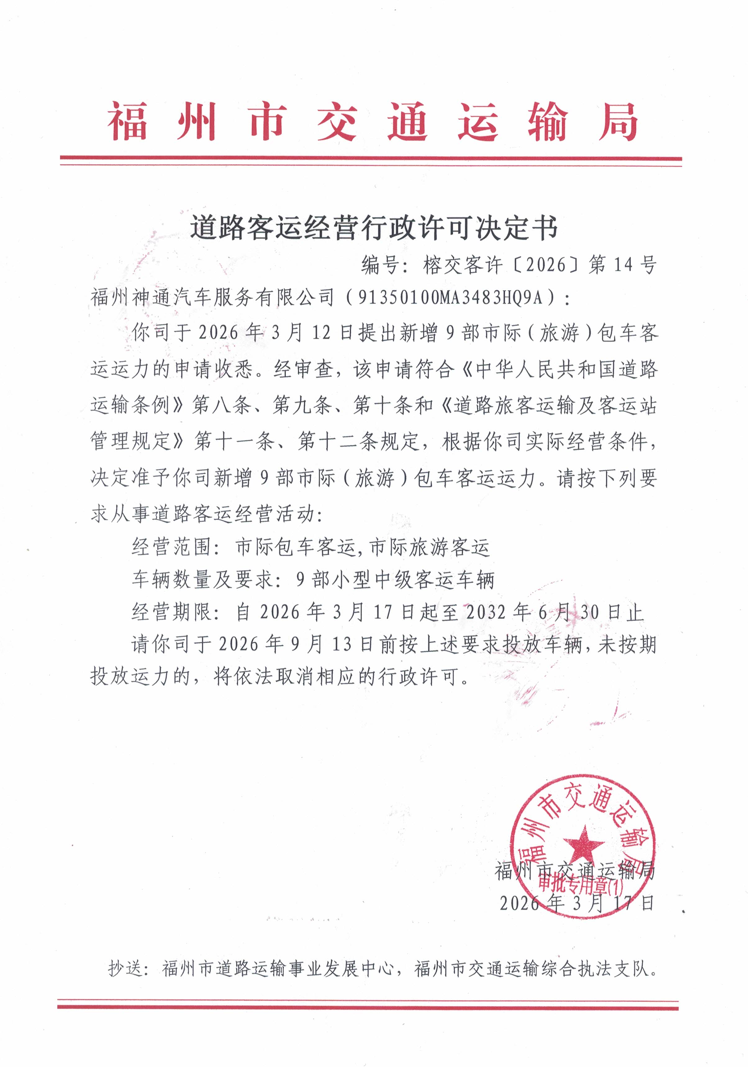 福州市交通运输局关于道路客运经营行政许可决定书(榕交客许〔2026〕第14号)