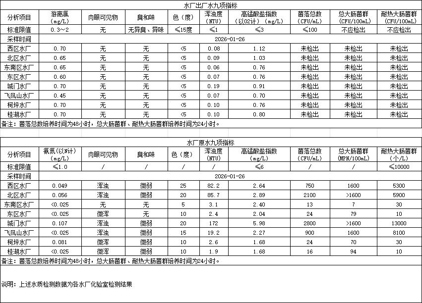 2026年1月26日供水水质信息发布