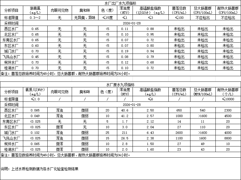 2026年1月28日供水水质信息发布