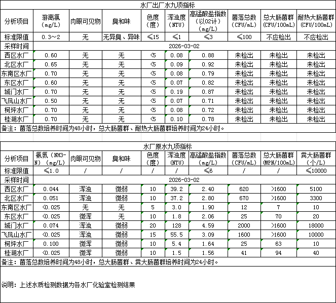 2026年3月2日供水水质信息发布