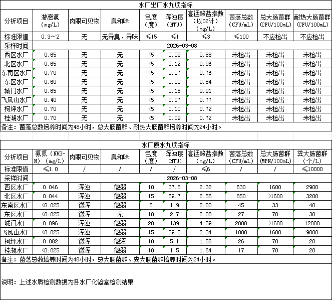 2026年3月8日供水水质信息发布