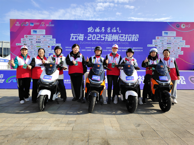 赛事当天,由福州市红十字会面向全社会招募选拔的102名AED骑行应急救护志愿者,化身赛道上最灵动的“生命防线”。这支由红十字救护师资和在职医护人员组成的专业队伍,骑着配备AED设备和急救包的巡回电动车,沿优化后的赛道分段巡逻,每公里赛道安排2部车辆来回值守,实现全程无死角覆盖。赛事中,骑行志愿者凭借扎实的急救技能和敏锐的观察能力,对出现体力不支、肌肉痉挛等状况的选手第一时间介入帮扶,累计提供应急救助服务百余次。通过与赛事“一键报警+北斗实时定位”信息化指挥系统联动,志愿者实时同步赛道情况,配合救护车、定点医院及转运路线,构建起“发现—干预—转运”的快速响应链条,确保突发状况高效处置,成为专业医疗力量的重要补充。