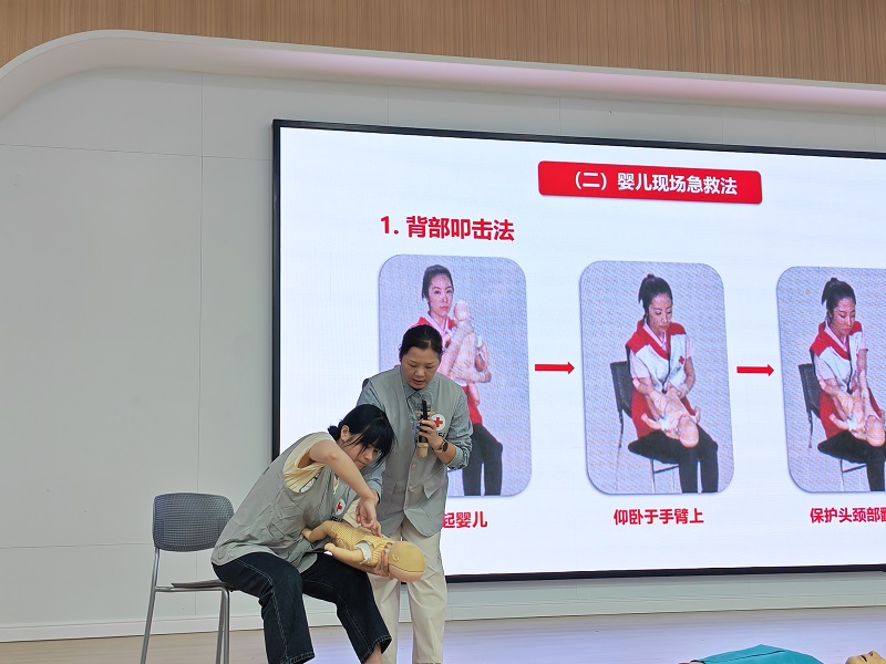 活动现场,红十字救护师资围绕幼儿园日常生活中可能遇到的紧急情况,重点讲解了气道异物梗阻法、心肺复苏(CPR)的操作流程与要点、常见烧烫伤的应急处理以及伤口包扎的基本技巧等关键内容。通过理论讲解与模拟实操相结合的方式,力求让每位参与者都能听得懂、学得会、用得上。