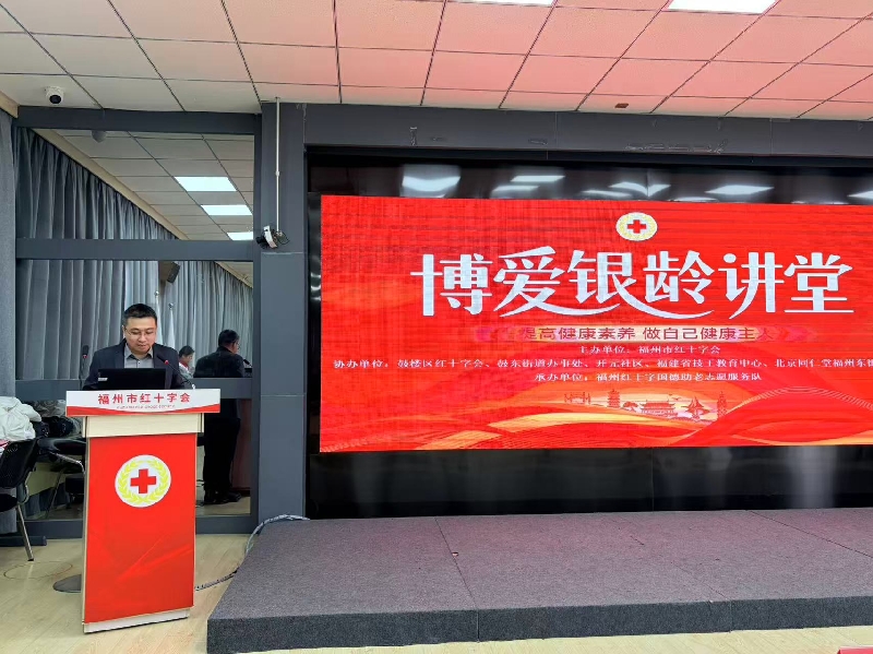 活动在温馨的氛围中拉开帷幕,主持人详细介绍了“博爱银龄讲堂”的活动背景与核心目的,让现场老年朋友清晰了解讲堂的服务内容与意义。福州市红十字会党组成员、副会长吴志扬致辞,向现场老年朋友致以拗九节的美好祝福,同时深入阐释了开办“博爱银龄讲堂”的初衷。他指出,福州四城区老年人口密集,老旧小区老年人面临居家安全、慢性病管理、智能技术应用等诸多难题,开办讲堂是红十字会践行“人道、博爱、奉献”精神,落实积极应对人口老龄化国家战略的具体实践,更是打通养老知识普及“最后一公里”的民生举措。