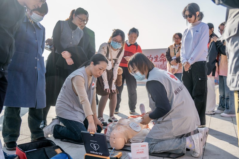 闽侯县红十字服务团在现场宣传普及应急救护知识,通过“讲解+演示”相结合的方式,现场教授心肺复苏、气道异物梗阻等急救技能,吸引不少市民驻足学习与实操。