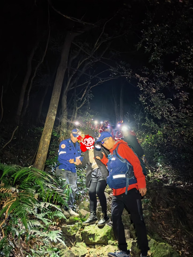 上山容易下山难。年长女性不仅体力不支,而且穿着修身西装外套、厚底鞋,在湿滑山路上更是举步维艰。此时,省山地救援队也赶到现场。两支队伍默契配合,一左一右搀扶被困者,在泥泞陡峭的山径中缓缓下移。