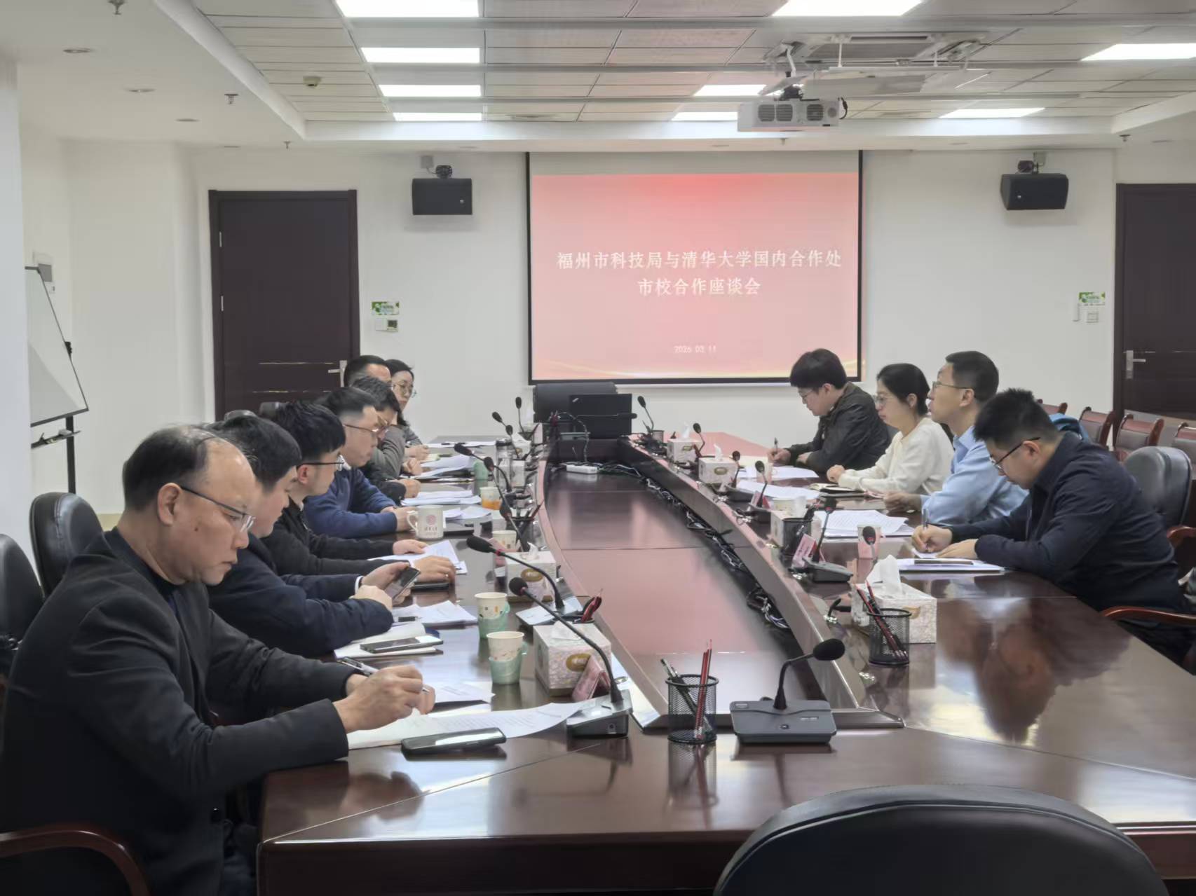 3月11日,福州市科技局与清华大学国内合作处召开市校合作座谈会,加强清华与福州在成果转化、两岸融合、校企交流等方面合作,为设立“福州-清华创新专项”打下基础。福州新区投促局与福州市人才集团共同参会交流。