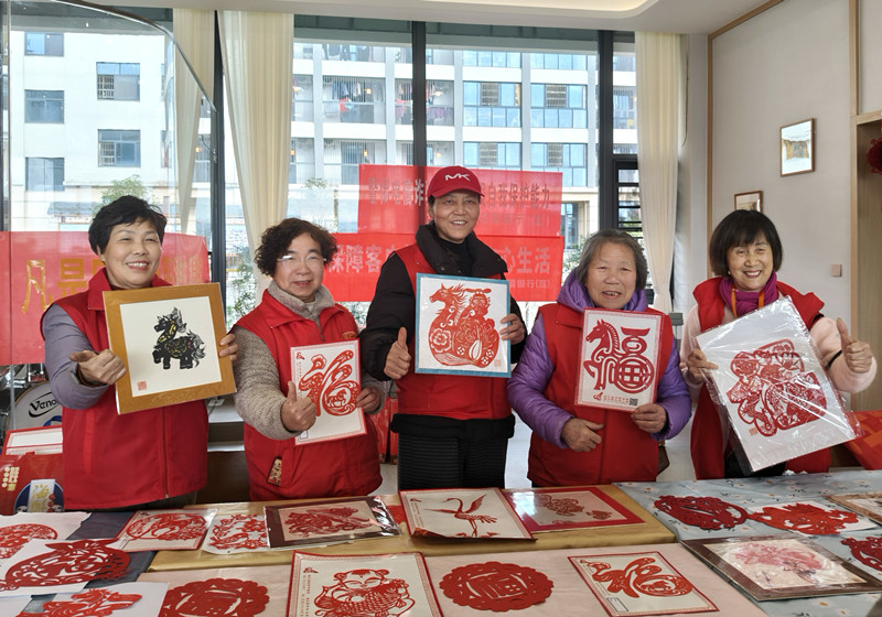 活动厅里,老年大学闽剧班的志愿者们一亮相,便赢得满堂彩。经典选段《宝莲灯》韵味醇厚,亲切的方言戏歌《番薯歌》勾起许多老人的回忆。有人跟着轻声哼唱,有人用手打起拍子,现场仿佛变成了一个小戏台。剪纸摊位前围满了好奇的老人。“送您一个‘福’字,愿您福气满满!”志愿者们有的介绍剪纸样式,有的现场演示剪窗花的技巧。当红纸展开,变出精美的“福”字和窗花时,养老院的老人们都连连称赞。“我要这副‘平安如意年年好’!”书法志愿者的桌前排起了队。大家挥毫泼墨,一副副寓意吉祥的春联、一张张饱满的“福”字陆续出炉,墨迹未干就被老人们开心地领走。红彤彤的春联捧在手中,年味顿时扑面而来。摄影班的学员们端着相机,穿梭在活动现场,专注捕捉每一个温馨瞬间:老人看戏时专注的眼神、学会剪纸后灿烂的笑容、手捧春联时的满足……学员们说,要把这些笑脸做成一份特别的“春节影集”,送给养老院留念。