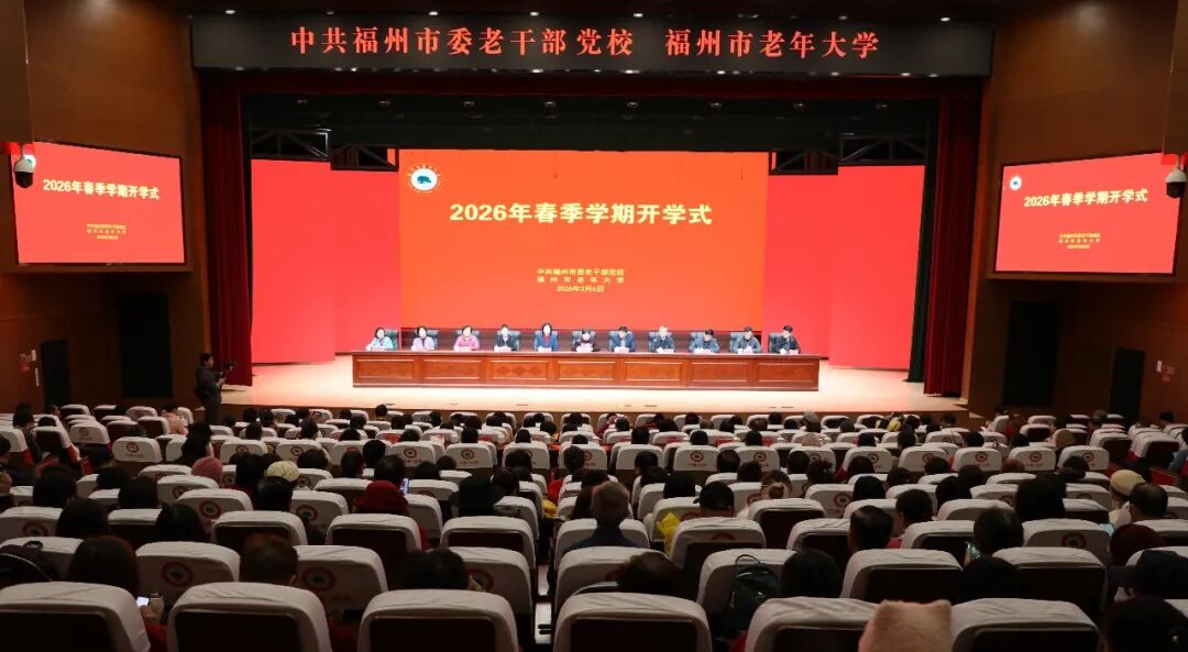 上午9时,300余名银发学子齐聚学校礼堂。在温馨而热烈的气氛中,春季开学式正式拉开帷幕。十三届市政协主席、市老年大学校长何静彦致辞,用“红、新、暖、实、广”五个字,凝练总结学校2025年的发展成效,也为2026年描绘出一幅清晰的奋进蓝图——今年恰逢福州市老年大学建校暨全市老年教育发展40周年,也是“十五五”规划的开局之年。学校将着力打造红色党建、教学教研、数字教育、金色年华、文化校园五大品牌,让老年教育高质量发展的步伐走得更稳、更实、更有力。她寄语全体学员:永葆进取之心、涵养奉献之情、展现时代风采,在老年大学这片沃土上收获知识、快乐与温暖。