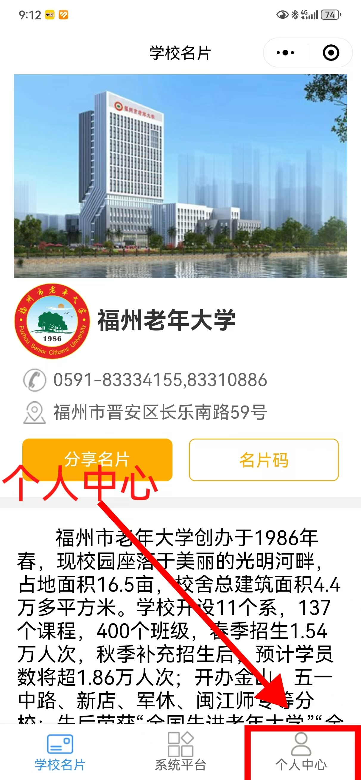 第一步:微信搜索【福州市老年大学】小程序或者通过“福州市老年大学微信公众号”,点击“自助平台”—“微信小程序”进行报名。