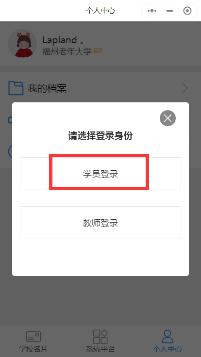 第三步:学员首次进入小程序,点击【个人中心】弹出确认身份弹窗,选择【学员登录】,进入学员登录界面。
