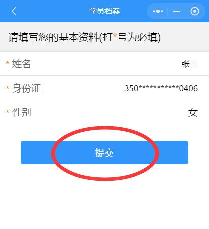 页面跳转至学员档案,学员在此页面进行信息的核对和完善,填写完毕后点击【提交】按钮,保存成功后若学员退出小程序,再次进入无需再次绑定;