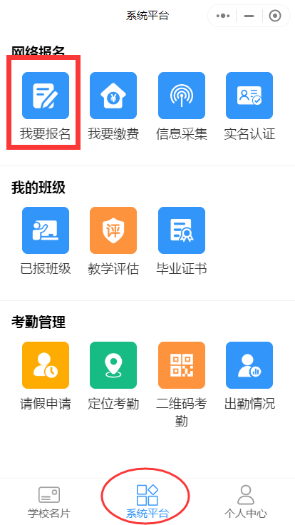 第四步:回到系统平台页面,点击【我要报名】菜单进入报名页面。