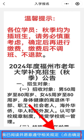 第五步:请仔细阅读招生公告,阅读完成后,请点击页面底部的【我已仔细阅读并同意接受】。