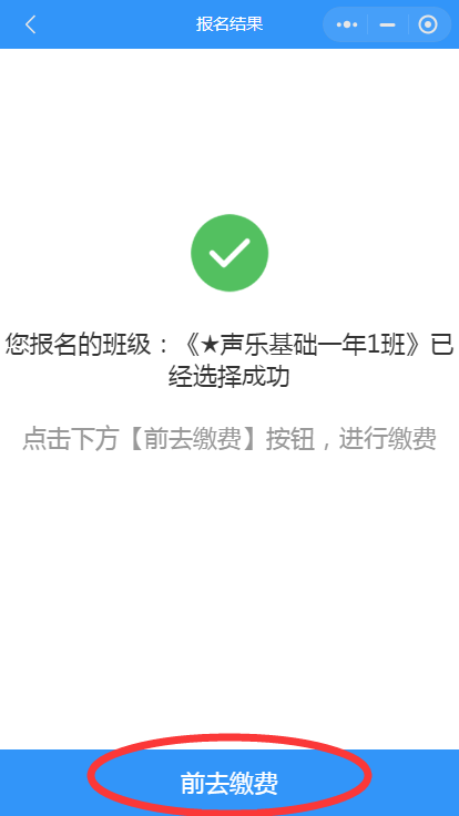 第八步: 选班成功,生成缴费订单,点击蓝色【前去缴费】跳转至缴费页面。