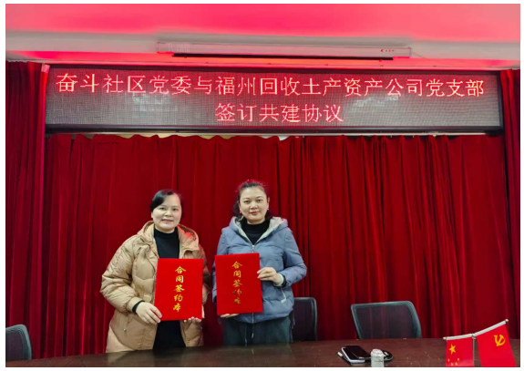 为深入贯彻落实新时代党的建设总要求,推动基层党组织建设全面进步,深化近邻党建工作,1月8日下午,回收土产资产公司党支部与台江区奋斗社区党委《党建共建协议》签约仪式在奋斗社区举行。
