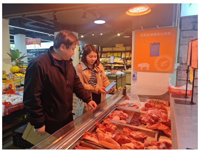 检查组一行深入超市生鲜、熟食、粮油、冷链食品等重点销售区域,通过现场检查、查阅台账、询问交流等方式,从三个方面对超市的食品安全管理状况进行了全面细致的检查,一是制度与资质管理方面,详细核查了超市供应商资质档案、食品进货查验记录等管理台账,确保源头可溯、资质齐全、人员合规;二是超市现场卫生与贮存状况,重点检查了生鲜果蔬、肉类、冷链食品的贮存环境,严格查看冷藏、冷冻设备运行温度是否符合规定,生熟食品是否做到有效隔离存放、离地离墙,场所环境卫生是否始终保持整洁干净;三是食品质量与标签情况方面,随机抽检了在售预包装食品和散装食品,逐一核对生产日期、保质期、贮存条件及标签标识是否规范、清晰、完整,严厉杜绝销售“三无”、过期、变质食品。