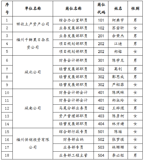 根据《2025年福州市供销合作社联合社直属单位公开招聘公告》,经组织笔试、面试、体检、考核等程序,现将各直属单位拟聘用人员予以公示,自发布之日起公示五天。公示期间欢迎群众来电反映情况。公示电话:0591-83282105。