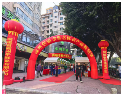 门店外由福州干鲜果日杂农资公司与福州榕供城北农业服务有限公司携手打造的“闽疆台优品聚,供销惠民暖人心”名优产品展销区,是福州供销企业服务三农、促进跨区域交流合作的重要举措。活动现场设置了31个展示展销展位,汇聚福建、新疆、西藏、台湾等地的名优特色产品,既让福州市民品鉴到不同地域的优质农产品,又为广大农民搭建了展示展销平台,践行供销企业城乡互动、助农共赢愿景,有力推动 “三农” 事业蓬勃发展。