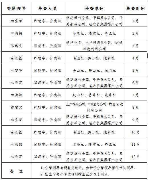 2021年对所属企业的安全生产监管工作,依据“党政同责、一岗双责、齐抓共管、失职追责”和“三个必须”的要求,由分管挂钩联系单位的领导负责监管。安全检查由市社分管挂钩联系单位的领导带队,市社经济发展处处长和负责安全工作人员全程参与,每月安排检查3个基层单位,每个单位至少抽查3个网点(见附表,检查单位可根据实际情况适时调整)。