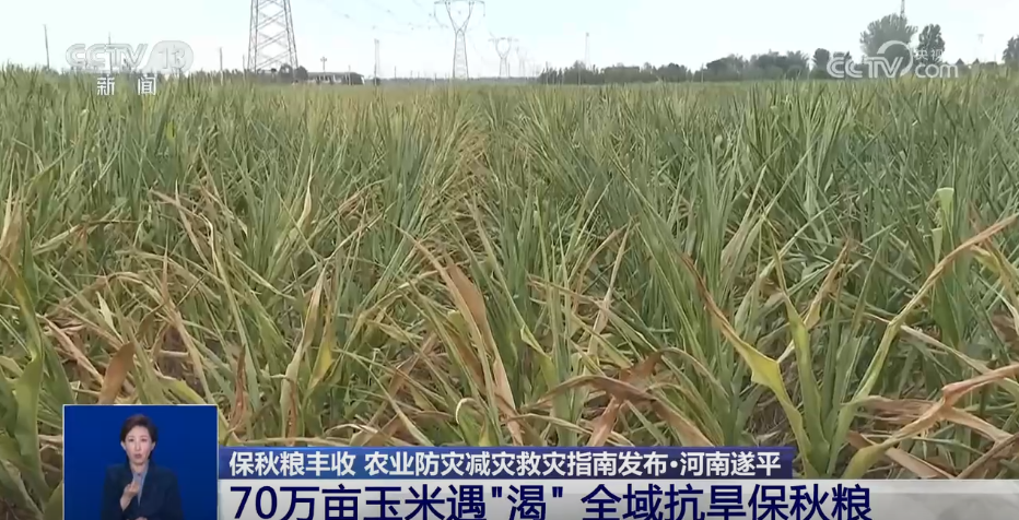 据了解,河南省的秋作物主要是玉米和花生,当前,玉米处在抽雄吐丝到灌浆结实的时期,花生处在开花下针到果实膨大的时期,水分需求量大,也是反应最为敏感的时期。目前,在河南驻马店的遂平县,全县70万亩玉米田急需浇灌。来看总台央视记者稍早前发回的报道。