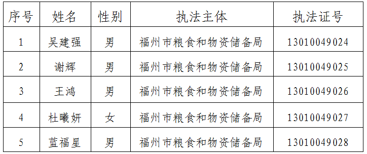 福州市粮食和物资储备局新增行政执法人员信息公示表