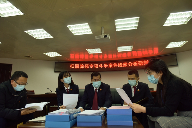 闽侯县纪检监察干部会同检察院相关工作人员对扫黑除恶专项斗争案件线索进行分析研判