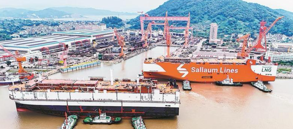 近期,由福建船政旗下马尾造船建造的一艘7500车LNG双燃料汽车滚装船和一艘4200车LNG双燃料汽车滚装船同日下水。唐辉 摄2023年,福船重工接到该订单。“作为首制船,时间紧、零经验,起初并不被业内看好。”福建船政重工总经理曾金柱说。