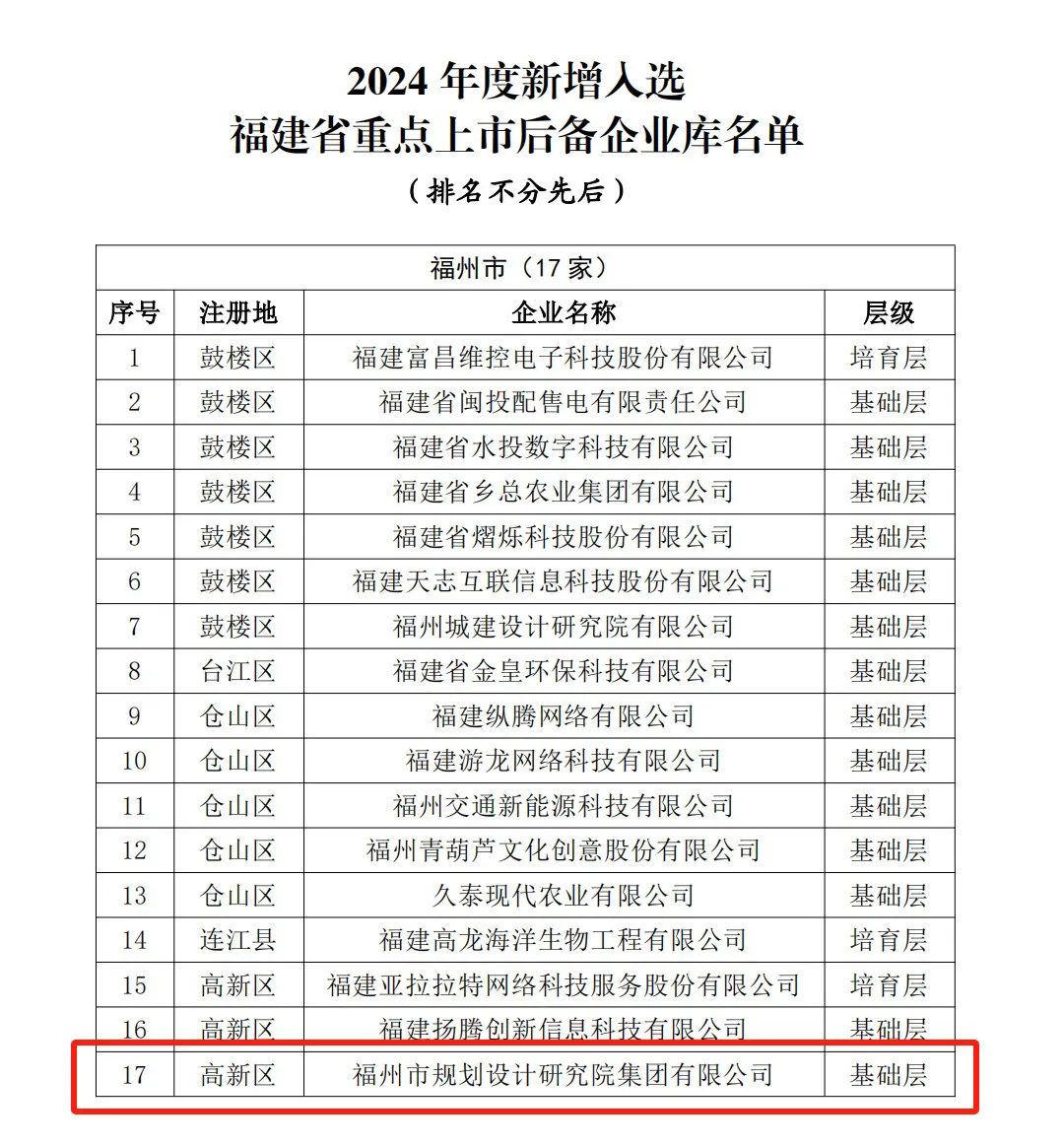 福州市规划设计研究院集团有限公司入选2024年度福建省重点上市后备企业库