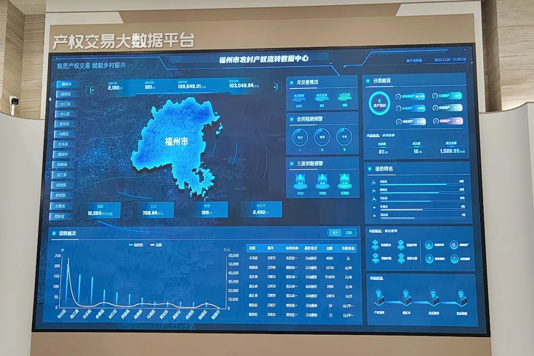 走进福州农村产权流转服务中心大厅,最吸引视线的莫过于一块几乎占据整面墙的电子显示屏。大屏幕上实时显示全市挂牌宗数、成交总额、月交易情况等信息,2000多个村的实时交易数据一目了然。
