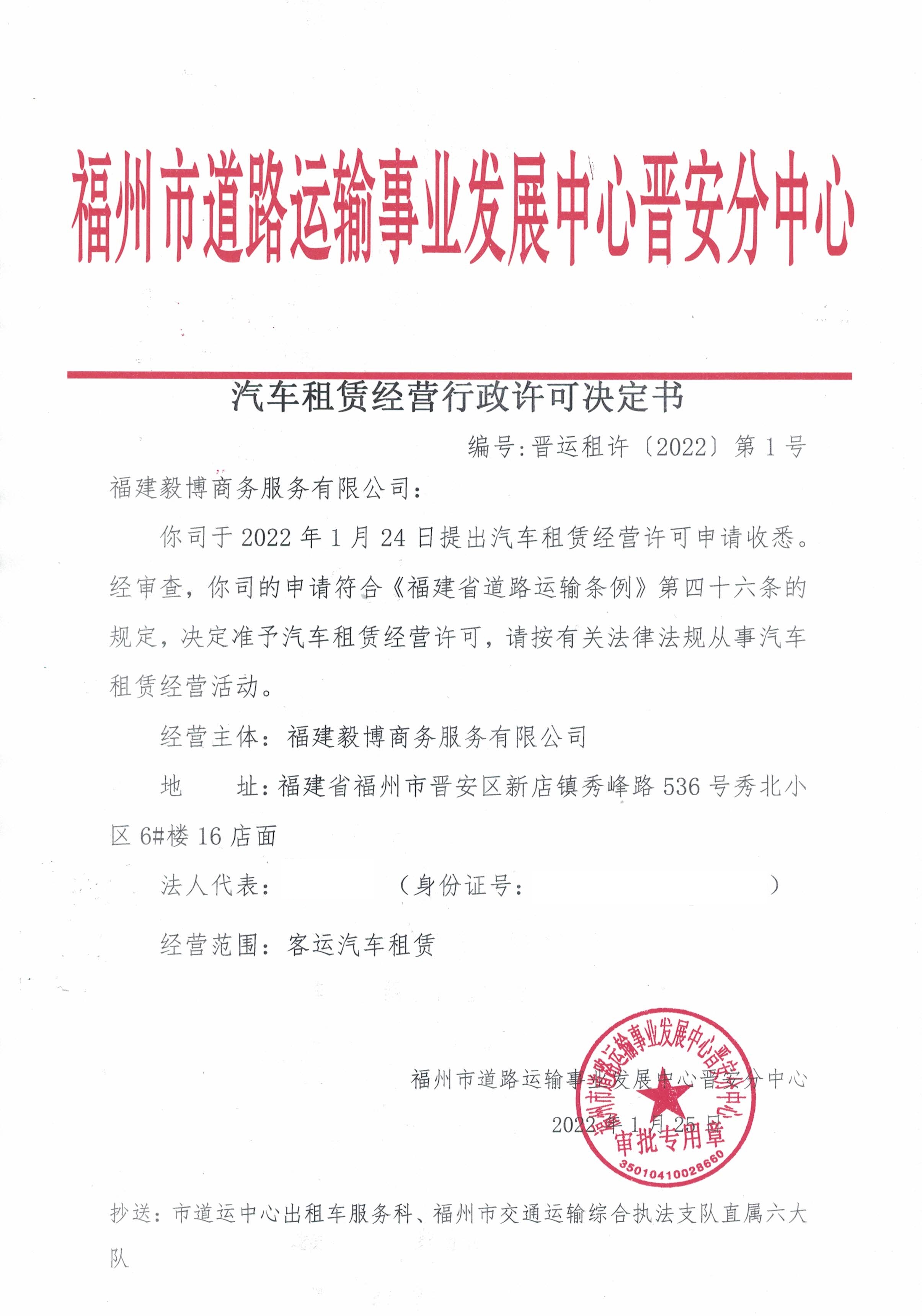 福州市道路运输事业发展中心晋安分中心关于福建毅博商务有限公司行政许可决定书的公示(晋运租许〔2022〕第1号)