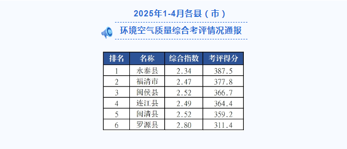 为贯彻落实党中央关于“打好污染防治攻坚战”“蓝天保卫战”精神,根据《提升福州市环境空气质量行动计划》和《福州市空气质量综合指数考评办法》,现将2025年4月及1-4月各县(市)区环境空气质量综合考评情况通报如下: