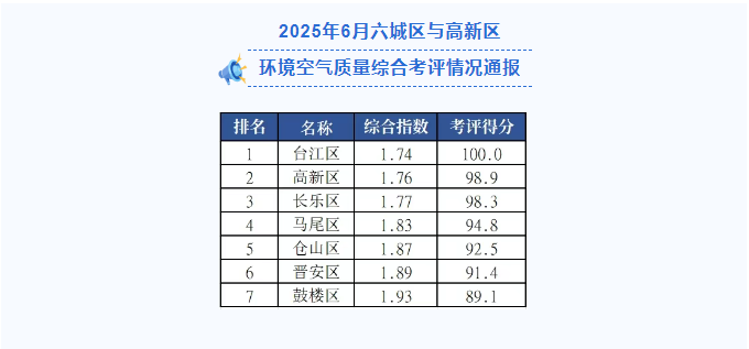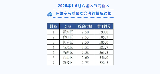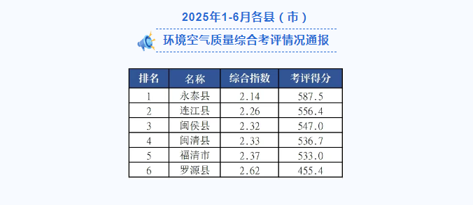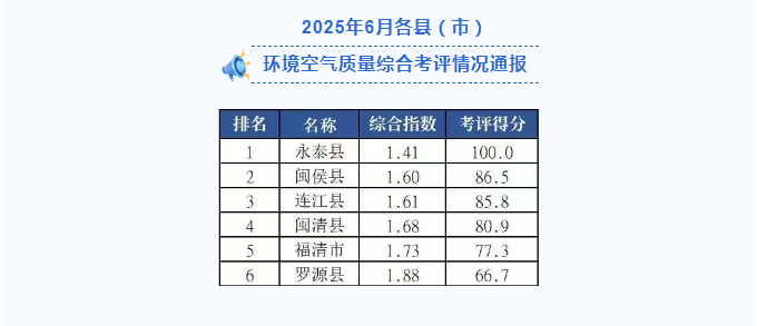 为贯彻落实党中央关于“打好污染防治攻坚战”“蓝天保卫战”精神,根据《提升福州市环境空气质量行动计划》和《福州市空气质量综合指数考评办法》,现将2025年6月及1-6月各县(市)区环境空气质量综合考评情况通报如下: