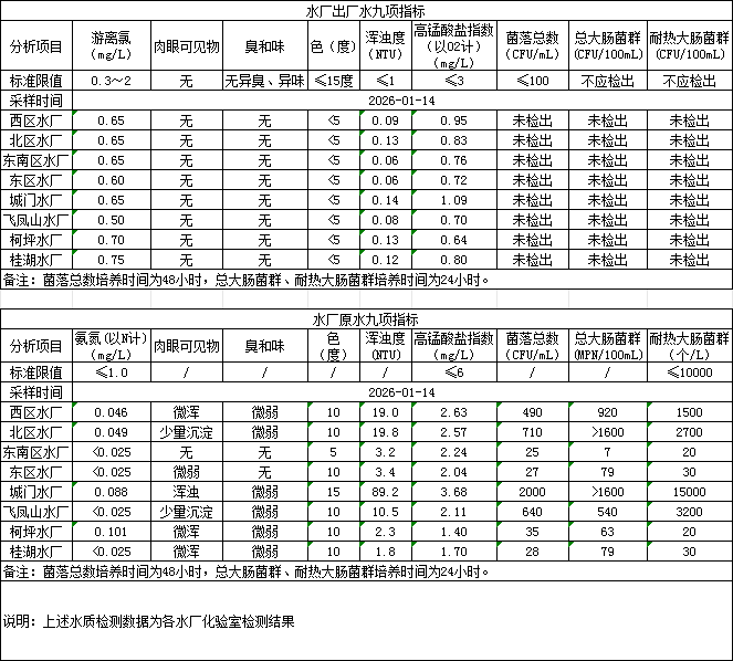 2026年1月14日供水水质信息发布