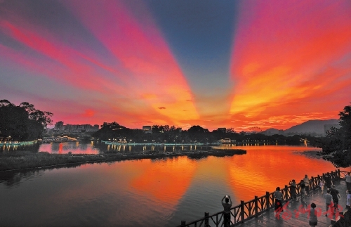 市民在西湖散步,欣赏美丽的晚霞。