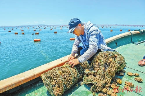 在连江县黄岐湾外海带养殖示范区一期项目海域,工作人员检查试验养殖贝类的生长情况。