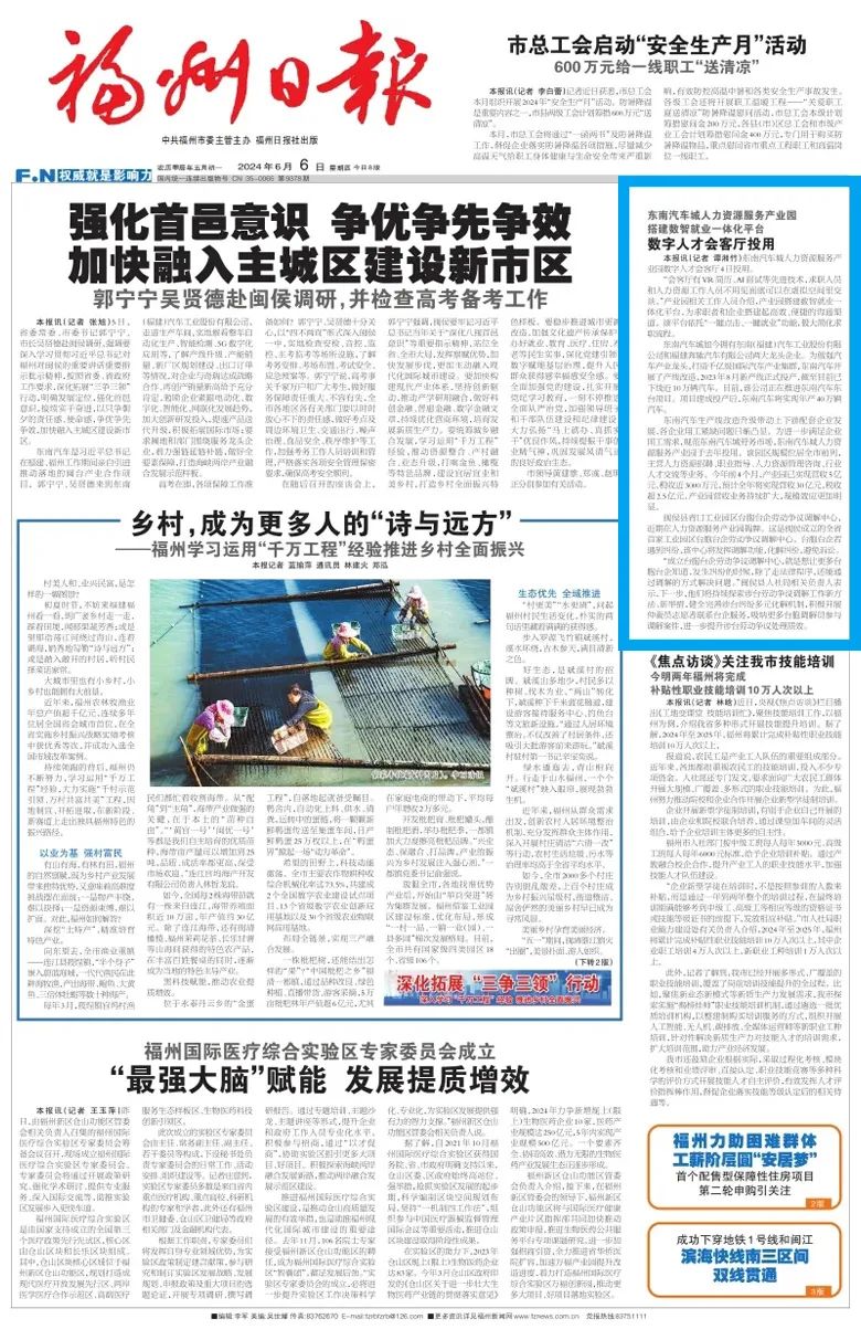 ▲(6月6日,《福州日报》第1版报道《数字人才会客厅投用》)