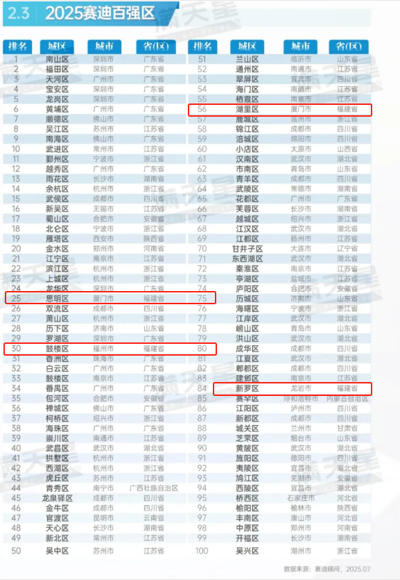 8月5日,赛迪顾问城市经济研究中心发布《2025年中国城区经济高质量发展研究报告》,报告中包含了“2025赛迪百强区”榜单,其中,福建4地入选,分为别:厦门思明区、福州鼓楼区、厦门湖里区、龙岩新罗区。