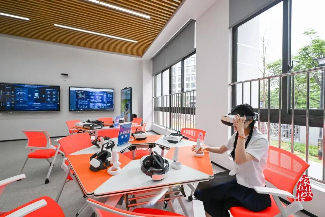 一条蜿蜒的彩虹桥连接东、西教学区,展示着学生的“五育”特长和成就,铺就“星光大道”。而这座学校的未来感,走进教室便可见一斑。