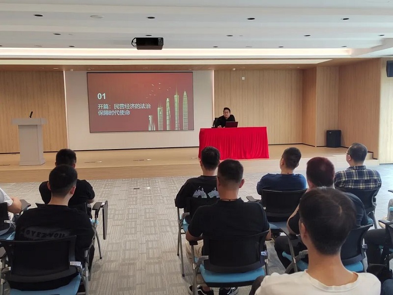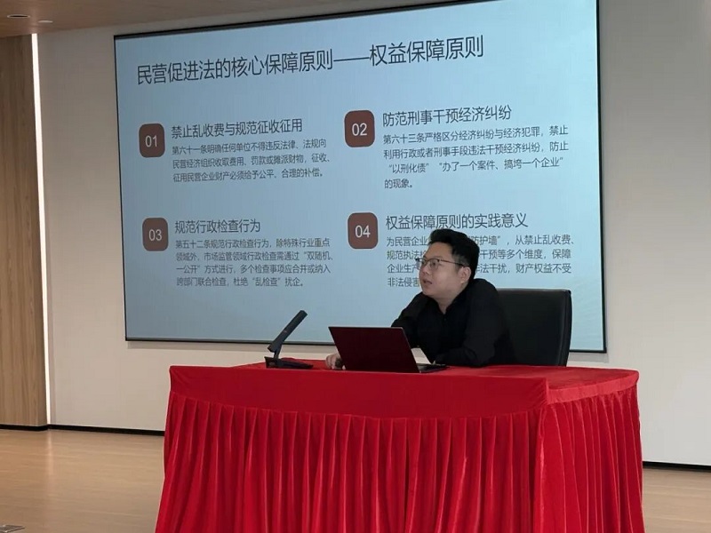 张律师从平等保护、公平竞争、权益保障三大原则入手,结合企业全生命周期法律风险,深入浅出地解读了法律如何为民营企业“撑腰”,并融合介绍了民法典的相关保障条款、省市的配套扶持政策。在随后的座谈交流环节,与会企业代表就经营中遇到的合同纠纷、债务化解、用工合规等问题与律师进行面对面沟通,现场互动积极,氛围良好。