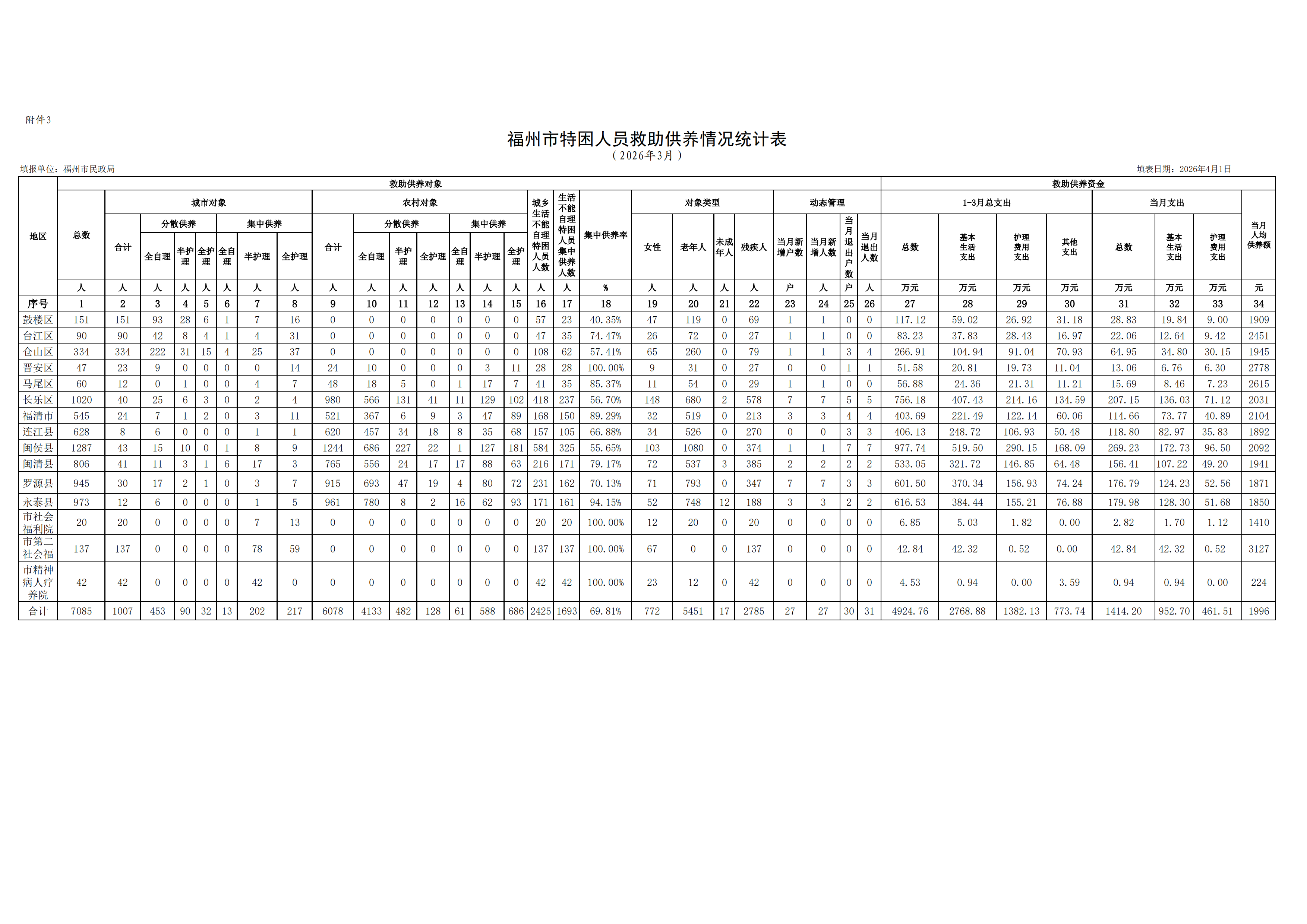 福州特困人员救助供养情况统计表(2026年一季度)