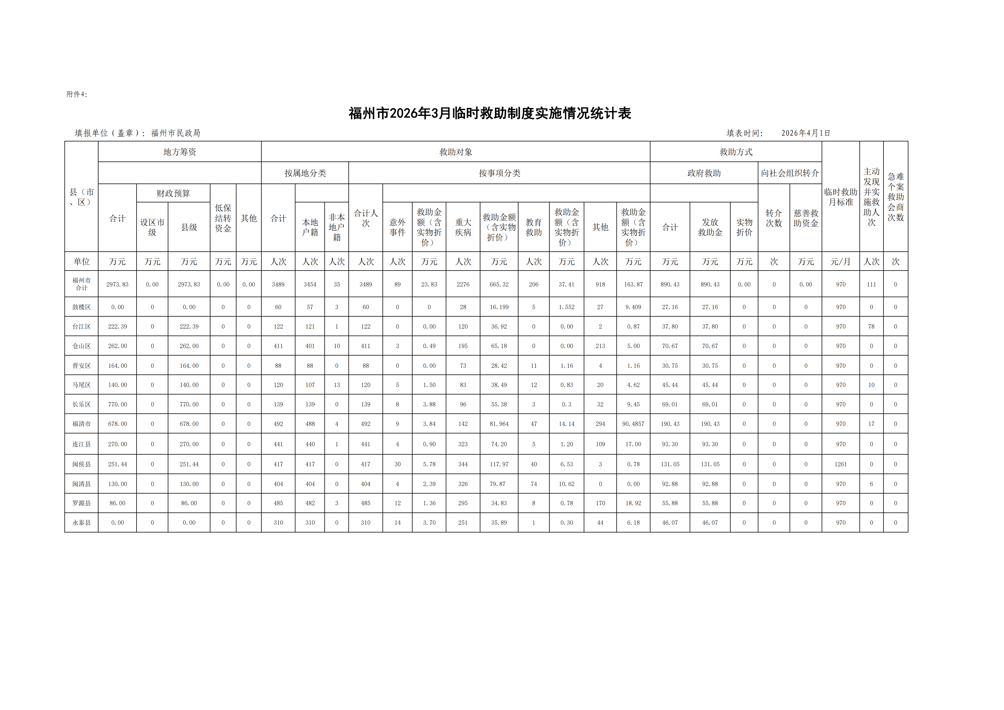 福州市临时救助实施情况统计表(2026年一季度)