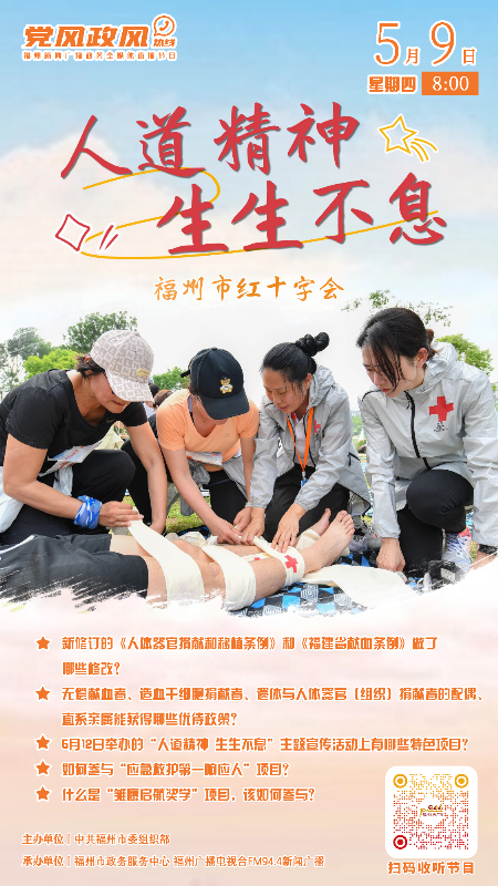 5月9日上午8:00,福州广播电视台FM94.4新闻广播党风政风热线栏目将开设《人道精神,生生不息》专题,届时福州市红十字会相关工作人员将上线开展红十字运动知识传播,并现场解答群众咨询。欢迎收听!