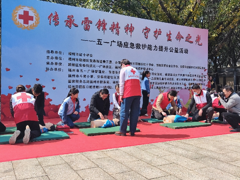 当天,在福州市红十字会的指导下,安泰街道五一广场社区携手鼓楼区红十字会、鼓楼区社会工作部等多家单位,共同举办“传承雷锋精神 守护生命之光”应急救护能力提升公益活动。现场通过理论讲解、情景模拟和实操演练,让居民群众掌握急救技能,成为守护生命的“第一响应人”。