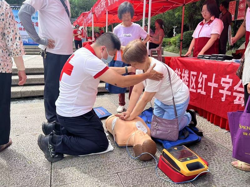 活动现场,各协办单位紧扣安全生产主题,向群众普及应急救援、消防安全等多领域的安全知识。鼓楼区红十字会也充分发挥自身专业优势,组织应急救护培训师开展急救知识教学,以标准规范的动作演示徒手心肺复苏术和AED的使用全流程,邀请群众参与实际操作,并在一旁手把手指导,现场学习氛围热烈。