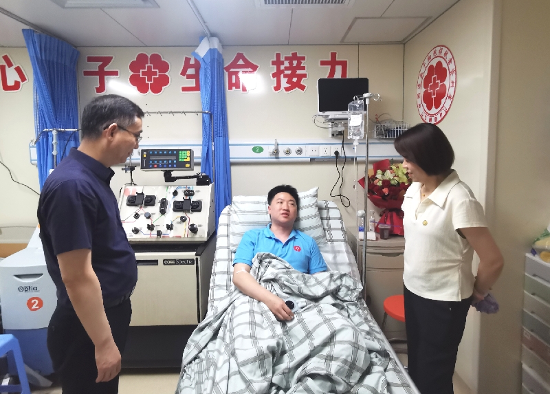 幸遇良师益友,救生志同道合。准备捐献期间,正处于医师规培期的黄邵融,曾一度担心请假会有阻力,当他向所在科室与医院教育处等相关部门表达捐献的抉择时,领导和同事不仅对他的身体状况表示关心,对他的捐献行为更是给予了赞赏与支持,让他放心地投入捐献准备工作中。采集当天,福建医科大学附属第一医院副院长柴大军等一行专程前往采集室看望黄邵融,关心慰问他的工作生活,高度赞扬他的无私奉献精神和治病救人的初心使命。
