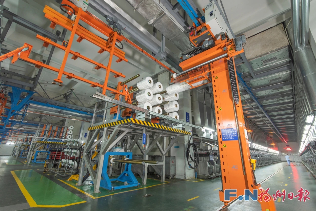 而如今,纱线在自动化设备上高速运转,原料在机械臂“指挥”下流向产线,万米长的产品仅重5克……走进位于福建省福州新区(长乐区)的福建永荣锦江股份有限公司(以下简称永荣股份)超细旦锦纶生产车间,偌大的厂房内仅有2名工人,管控着30多台设备井然有序地作业。